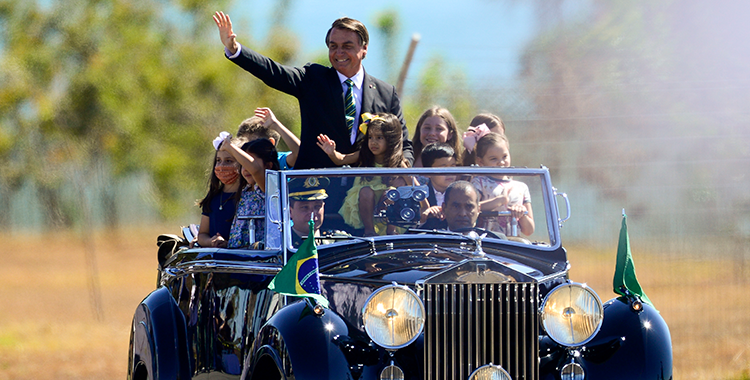 Sem o tradicional desfile militar por causa da pandemia do covid-19, o presidente Jair Bolsonaro cumprimentou populares numa cerimônia de cerca de meia hora no gramado do Palácio da Alvorada para celebrar o Dia da Independência. O presidente esteve acompanhado da primeira-dama Michelle Bolsonaro, do vice-presidente Hamilton Mourão, de ministros e do presidente do Senado, Davi Alcolumbre. Bolsonaro assistiu ao hasteamento da bandeira e a manobras de aviões da Esquadrilha da Fumaça.